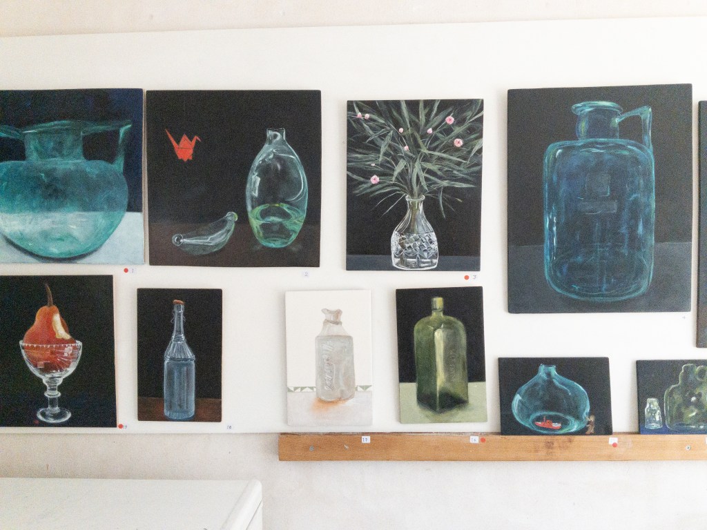 Karen has a diverse practice encompassing sculpture, drawing and painting. Trained at the Canberra School of Fine Art when we visited she was blowtorching a small organic sculpture on her studio kitchen counter top whilst along the counter top were numerous small scale bronzes for her bell jars which she was prematurely patina-ing. They were beautiful to behold in their various chemical creative stages. Her small paintings of landscape scenes displayed a light and color understanding that was deep and thoughtful and her sketch books were available for delving into for viewing pleasure.