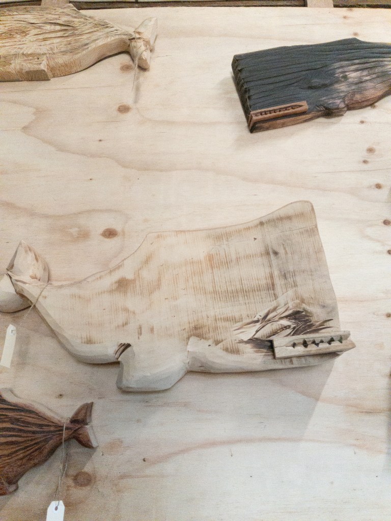 Ant creates wooden based sculptures predominantly depicting sea creatures both human and marine. We were attracted to the rawness of the wood, the originality to the form, his minimalistic approach and the tactility of the materials he embellishes with rough mark making as well as the humour. The apparent simplicity of his joinery was reminiscent of Northern American Inuit imagery and sculptures.